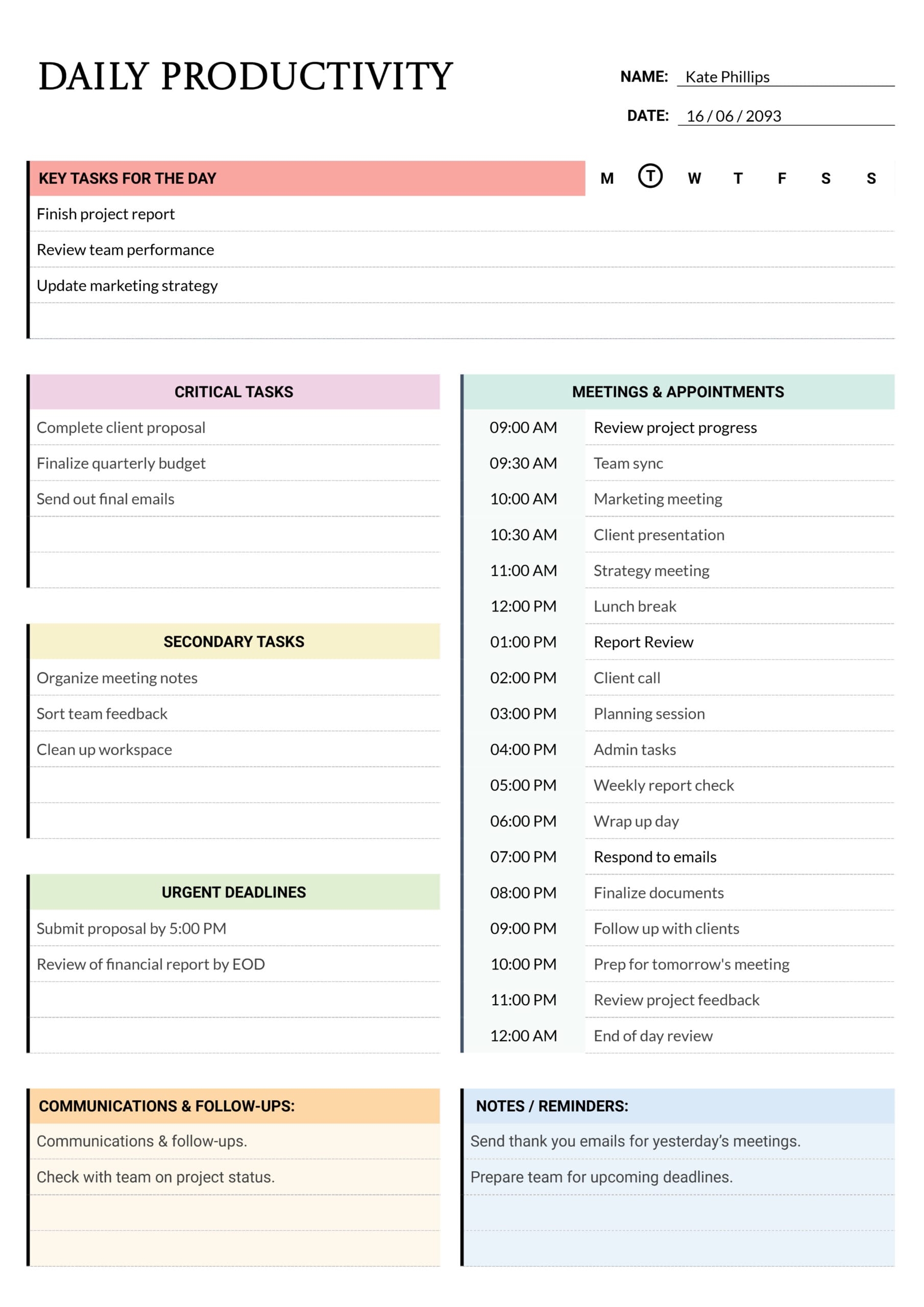 It also gives space for secondary tasks, urgent deadlines, communications, and notes, which works well for roles that juggle requests across the day such as coordinators, managers, admins, and client-facing teams. If your day changes often, keep the task list stable and adjust only the time blocks so the plan stays readable.